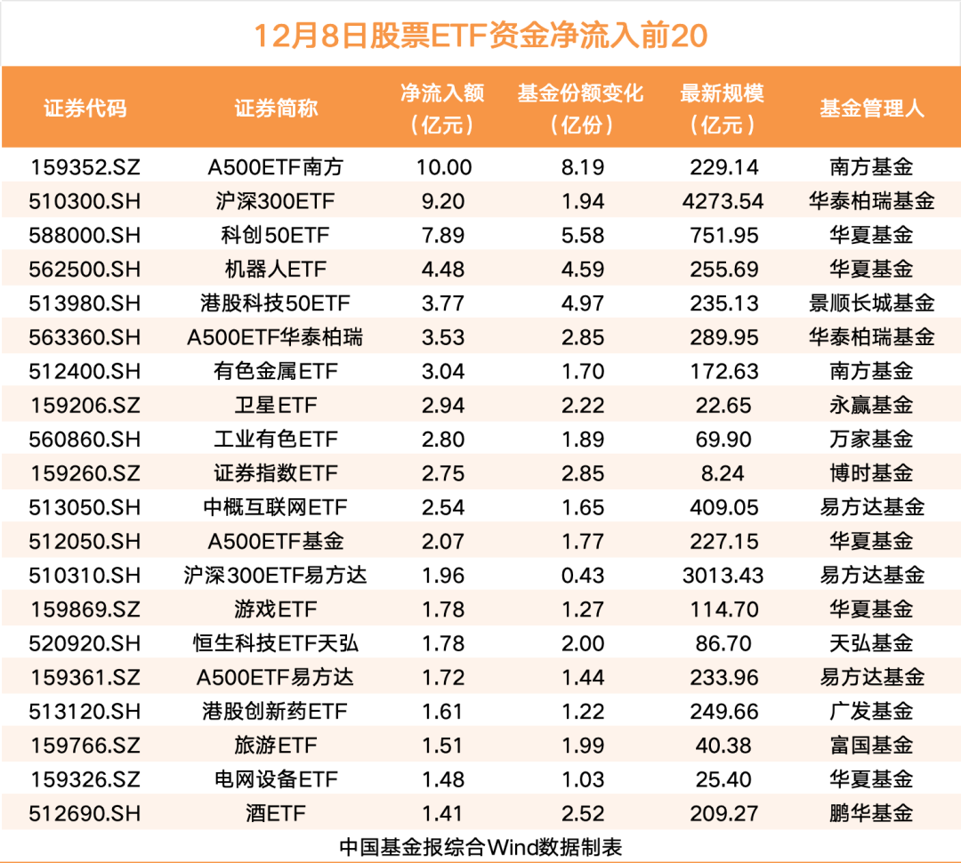 具體來看,12月8日共有29只ETF資金凈流入超1億元。其中,A500ETF南方以10億元資金凈流入排在第一位,華泰柏瑞基金旗下滬深300ETF、華夏基金旗下科創50ETF分別以9.2億元、7.89億元的凈流入排在第二位、第三位。