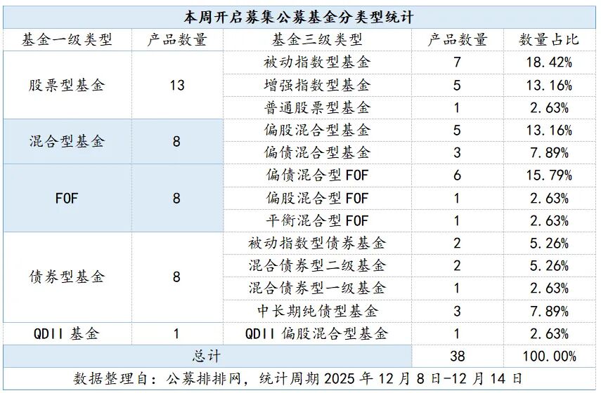 12月8日,公募排排網數據顯示,本周(12月8日至12月14日)有38只新基開啟募集,數量與前一周基本持平,已連續兩周維持在較高水平。